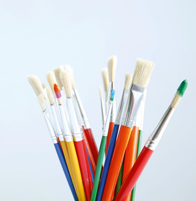 Az ecsetek nyele élénk színű, a szivárvány színeiben találhatóak meg a készletben, sörtéjük világos.