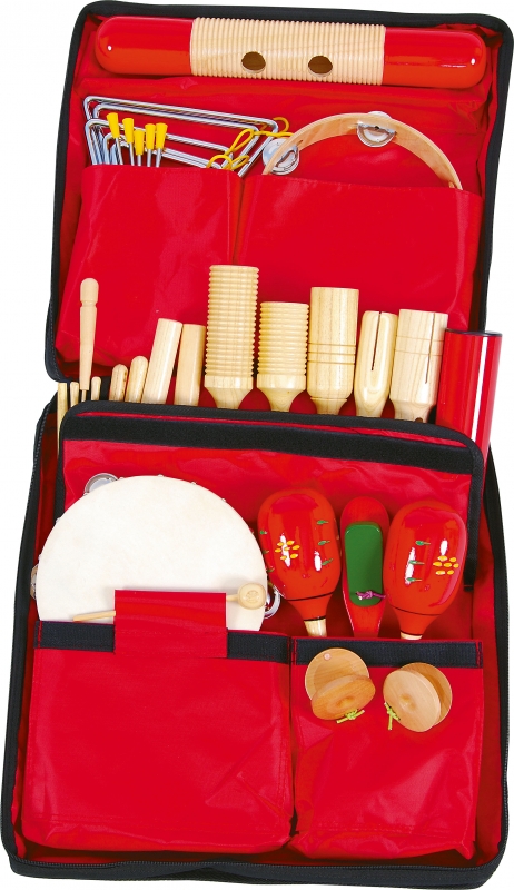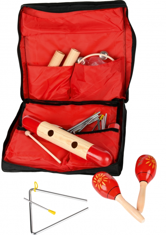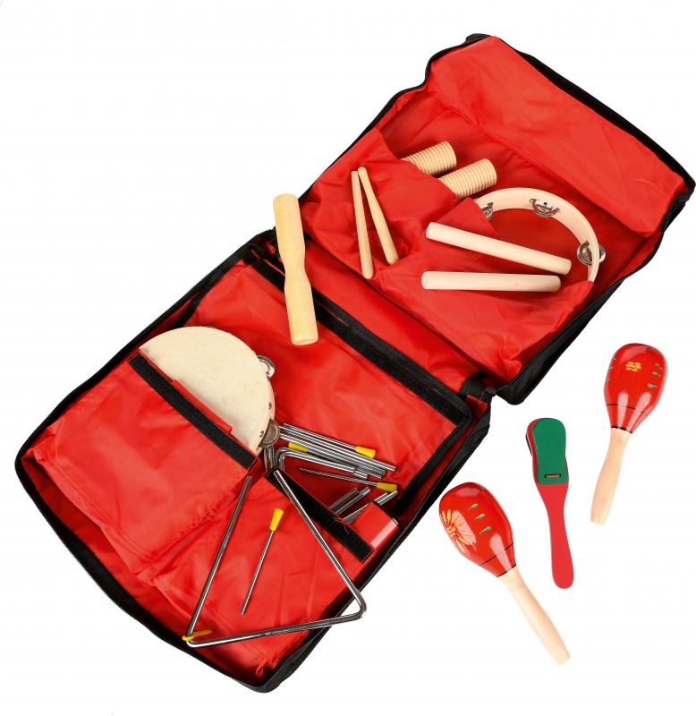 Készlet tartalma: csembaló, 5 db triangulum, maracas, nyeles kasztanyetta, csörgő dob, csörgő, nyeles fadob, agogó, ritmusbot, kasztanyetta