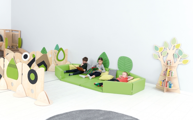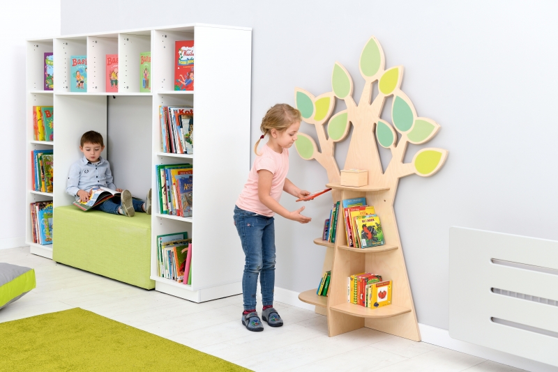 Fa alakú tárolópolc dekoratív levelekkel, rétegelt falemezből. 3 db 2-2 részre osztott polccal felszerelve könyvek, és játékok számára.