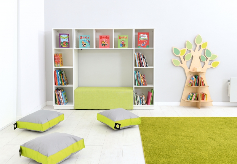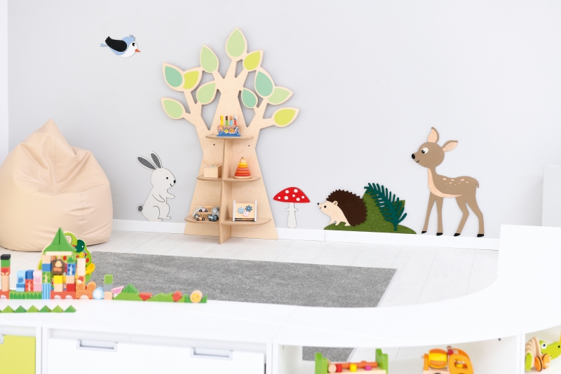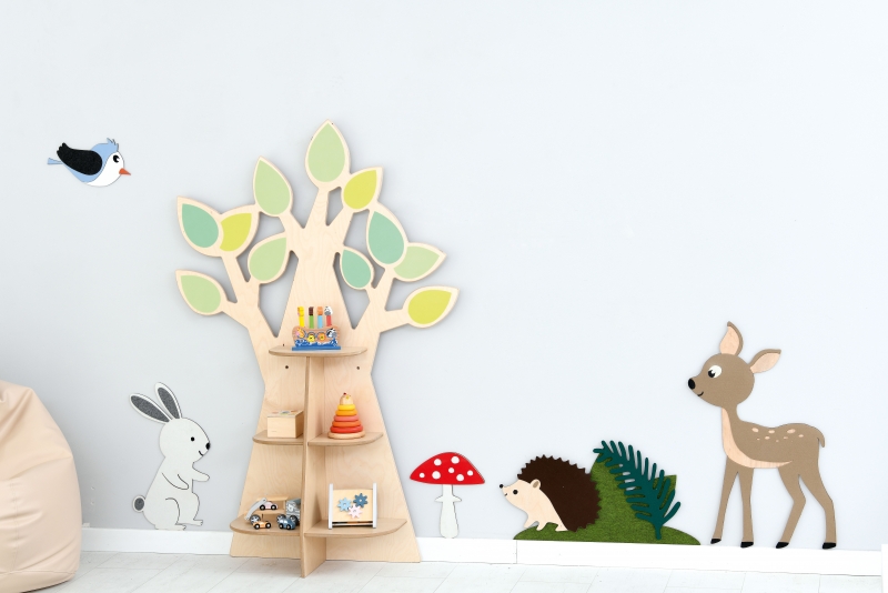 A dekoratív, fa alakú tárolópolc felpezsdíti a helyiség hangulatát.