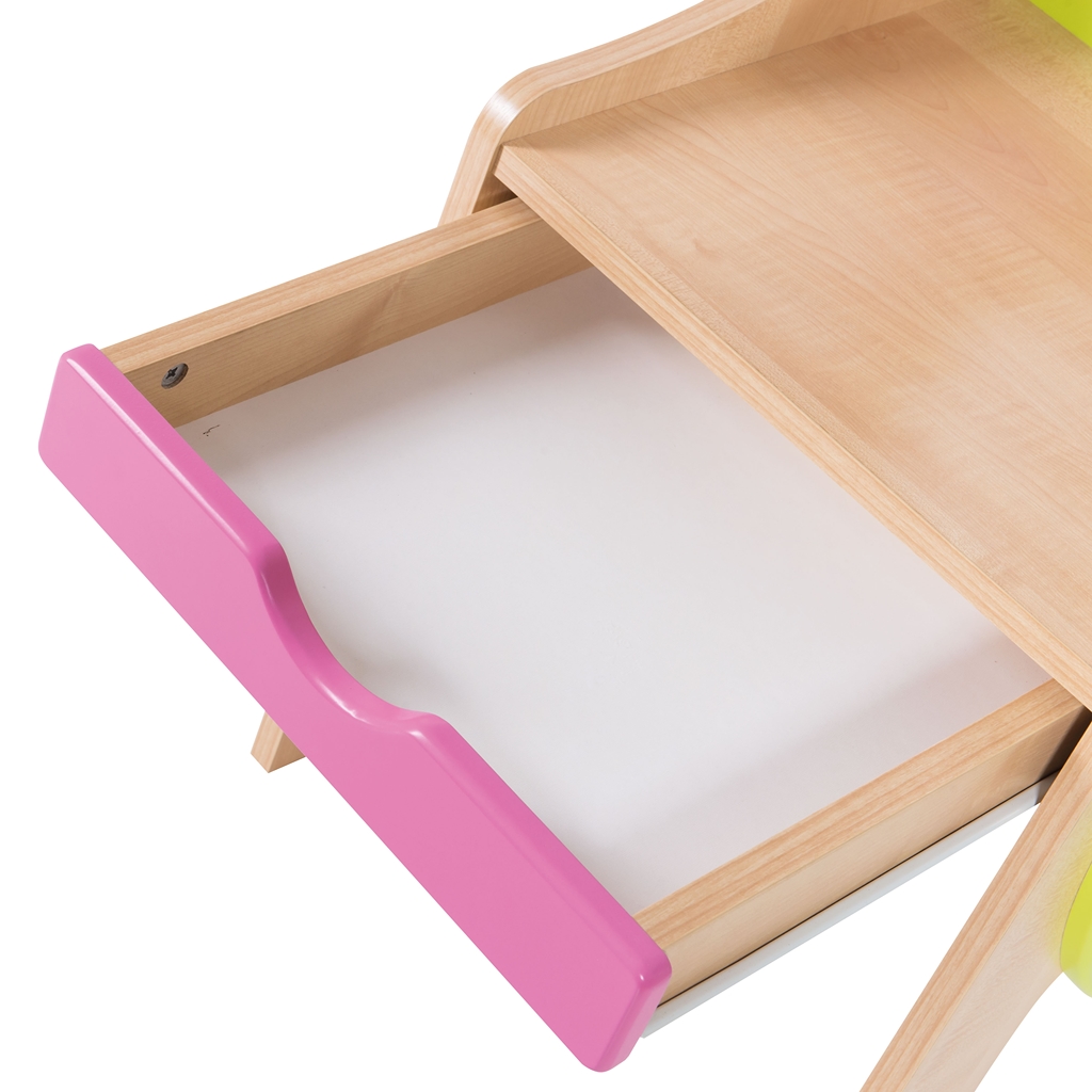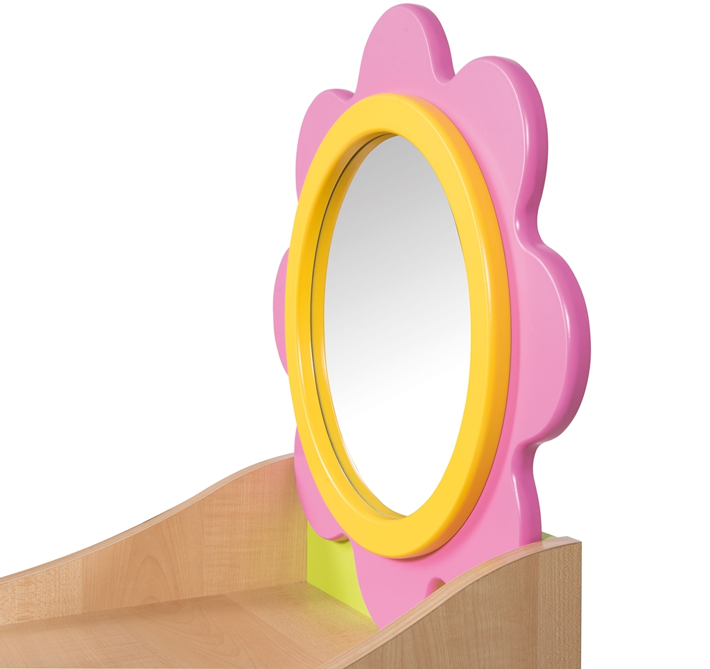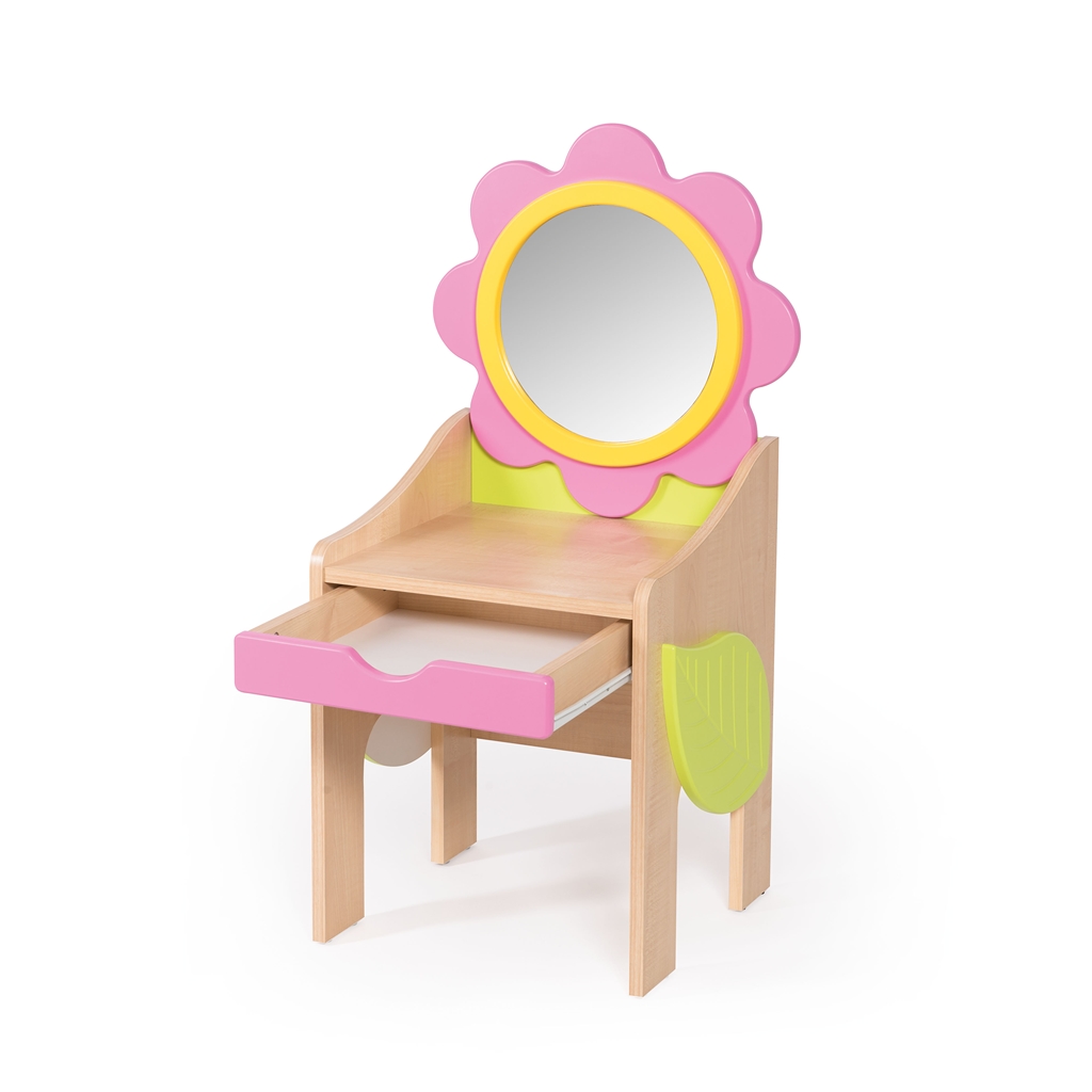 A kis fodrászasztal igazi tavaszi hangulatot áraszt, hiszen a kör alakú tükre egy rózsaszín, virágot ábrázoló keretbe van fogva. Ezen felül a szekrény oldalain élénk zöld színű levél formájú díszítőelemek is helyet kaptak.