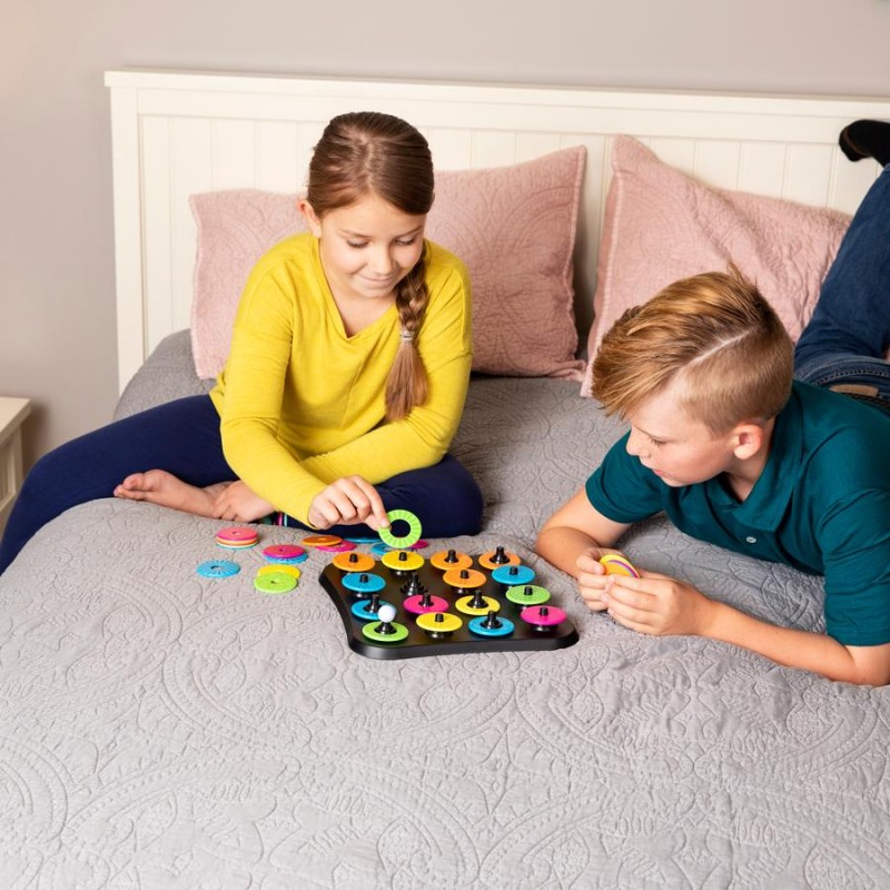 Az első játékos arra a mezőre helyezi a fehér labdát, amelyik korongon a legkevesebb, azaz 1 db eltérést lehet látni az eredeti koronghoz képest. Az eltérés lehet szín, minta vagy a korong közepén lévő lyuk nagysága. DE! Csak 1 eltérés lehet! A játékos addig folytatja a játékot, amíg talál olyan korongot, ami csak 1 tulajdonsággal tér el az előző korongtól. Ha az első játékos már nem talál többet, töltsük fel újra a táblát és a második játékos következik.