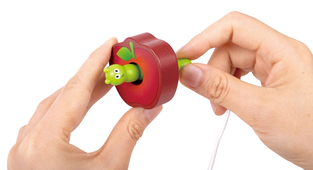 A fűzőfonal egyik vége kedves, mosolygós kukaccal van lezárva, így a kicsik könnyedén fel tudják fűzni a gyümölcsöket. A fonal másik végén egy levélke található, amely megakadályozza, hogy a felfűzött gyümölcsök leguruljanak a fonalról.