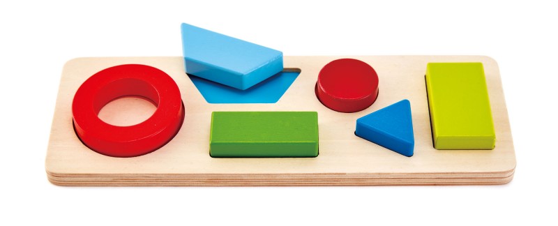 Tartalma: 1 db kétoldalú fa alaplap, 6 db különböző formájú fa geometriai alakzat. 2 nehézségi fokkal: