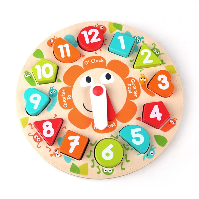 Tanuló óra és formaberakó számokkal. A számok az órán formaberakó játékként használhatók. A körben egymással szemben lévő formák azonos formájúak (kör, négyzet, háromszög, szív, ötszög, félkör. Segítségként az alaplapra a formák alá felrajzolták a megfelelő számokat, így nem csak a megfelelő forma nyújt útbaigazítást a gyerekeknek. Mókás állatkák is díszítik még a játékot: lepkék, csigák, pókok, bogarak. A kis- és nagymutató szabadon forgatható. Az óra számlapja egy stabil kitámasztónak köszönhetően döntve is felállítható. 13 darabos készlet: 1 db számlap mutatókkal, kitámasztóval, 12 db forma, számokkal 1-től, 12-ig.
