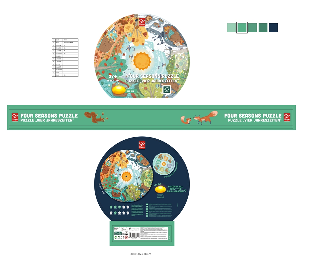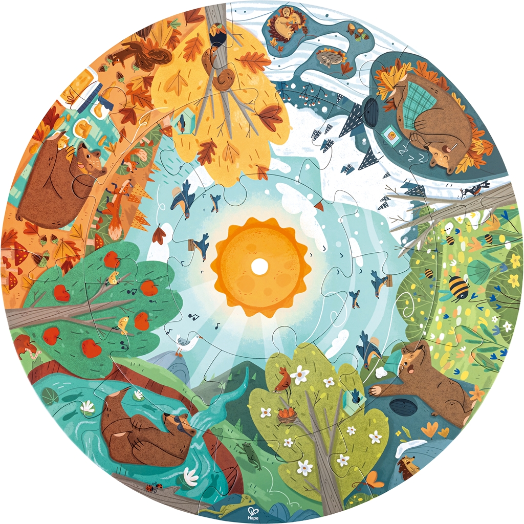 A Hape Négy évszak kirakója remek kiegészítője a környezeti nevelésnek, hiszen játékosan ismerteti meg a gyerekekkel az évszakokat, azok változásait, az évszakokra jellemző tevékenységet és időjárást is. Egy kedves mackó kíséri végig a gyerekeket.
