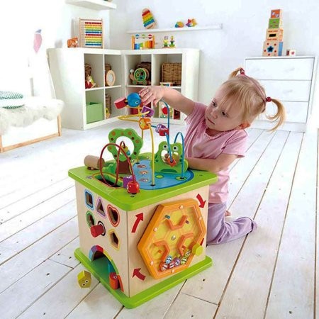 Ez egy fantasztikus, óriási Activity Kocka! Tömör fából, vízbázisú festékkel készült és éveken át tartó móka lehet. Nagyon biztonságos, 12 hónapos kortól már használható. Mozgásra, gondolkodásra, járásra ösztönzi a gyerekeket. El sem tudod képzelni mennyi mindent van rajta, mennyi mindent lehet vele csinálni! Főbb fejlesztési területek: finommotorika, szem-kéz koordináció, színek tanulása, felismerése, logikus gondolkodás. A kocka tetején található egy golyóvezető pálya. Itt egy lombos fán és egy kisbékán keresztül visz az út. Segíts hazatalálni a cuki kisállatkáknak. Található még a tetején egy kalapálós játék is. 3 db mókás golyónak van hely, melyeket ha belekalapálunk a kockába, egy golyóvezetőbe esnek, ahonnan a földszintig gurulnak. Az oldalán van még formabedobó is, ahol a különböző színes kis mértani testek laknak. Pl. szív, kocka, háromszög stb. Ha középen a nagy, piros gombot kihúzzuk, a formák leesnek és újra kezdődhet a játék. A formákat a színek segítségével is a helyükre tudod tenni! A következő oldalán egy labirintusszerű méhsejt található, amit ha elforgatunk, a kis méhecskék ide-oda röpködnek. A sok röpködéstől már elfáradtak, próbáld bejuttatni őket – kettesével – a helyükre. Amennyiben még pici a babánk, akkor is remek szórakozást ígér, ha a fogantyú segítségével csak tekergeti a narancssárga hatszöget, hiszen a méhecskék ide-oda mozognak benne. A negyedik oldala is rendkívül szórakoztató! Elkóboroltak a háziállatok. Szeretnének hazajutni. Segíts nekik! A színek most is irányt mutatnak! Személyes tapasztalat: járni nem tudó kisgyermek is boldogan felállt, hogy játszhasson vele. Belekapaszkodva biztonságosan állt mellette sokáig, hiszen a nagy méretének köszönhetően ez is lehetséges.