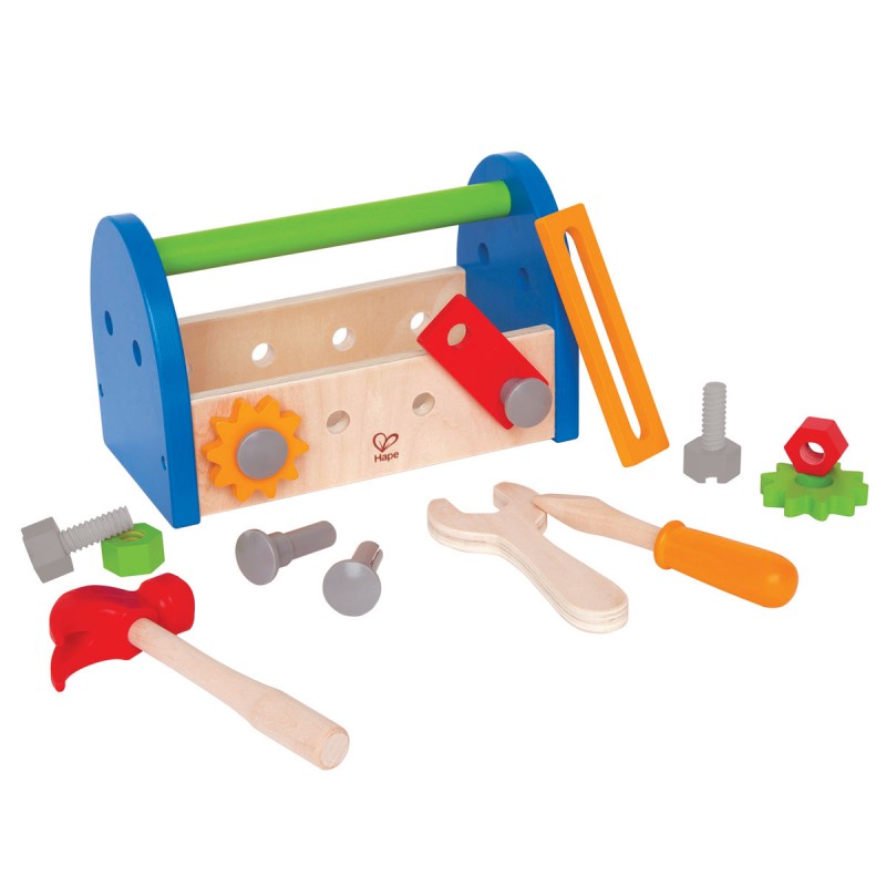 A Hape szerszámosládája természetes, fa anyagból készült, műanyag kiegészítőkkel. A láda, a szerszámok, a lyukacsos formák, fogaskerekek fából, a csavarok és anyák műanyagból készültek. A ládikó fogantyúja élénk zöld színű, magasabb oldalai kék színűek, alacsonyabbak natúrak. Kialakításának köszönhetően az oldalaihoz is lehet kiegészítőket csavarozni. A készlet összesen 14 darabból áll. Megtalálható benne egy piros fejű kalapács, egy villáskulcs, egy narancssárga nyelű laposfejű csavarhúzó, egy zöld és egy narancssárga fogaskerék, egy piros és egy narancssárga lapos és téglalap alakú elem lyukakkal, illetve egy darab zöld színű, háromszögletű, lyukacsos elem. Ezen felül tartozik a készlethez még egy piros, egy sárga és egy kék színű műanyag csavar, a hozzájuk tartozó anyákkal együtt és kettő szürke színű szög. Anyagának köszönhetően egy masszív és strapabíró játék. A játék mérete: 24x12,8x15 cm, a doboz mérete: 26x14x18 cm.