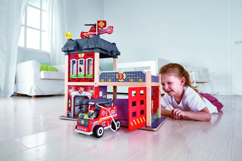 Ha egy ilyen tűzoltó állomás van a közelben, akkor minden katasztrófa helyzet könnyen elhárítható. Amikor megszólal a riasztó csengő, a tűzoltóautóval, vagy a helikopterrel hamar a helyszínre sietnek a lánglovagok. Akárcsak a filmeken, itt is az állomáshoz tartozik egy dalmata kutyus. A 13 darabos készlettel szuper kalandokat játszhat el minden kis tűzoltó. Tartalma: 1 db szirénázó tűzoltóállomás, 1 db forgatható, emelhető létrájú tűzoltóautó 1 db tűzoltó helikopter 1 db tűzoltó figura, melynek kezébe illeszthetőek a tűzoltó eszközök 1 db dalmata kutyus 1 db szekerce 1 db poroltó 1 db tűzcsap 1 db tűz 1 db mentés irányító pult Az épület tetején parabola antenna és az állomás zászlaja is kirakható. Az emeleten egy kis csengő kapott helyet, Ha megszólal, máris kiállhat a garázsból az autó. Nagyon menő kelléke lehet egy fiús gyerekszobának. Kiváló minőségű fa alapanyagokból készült, vizes bázisú, nem toxikus festékkel díszítve, műanyag kiegészítőkkel.