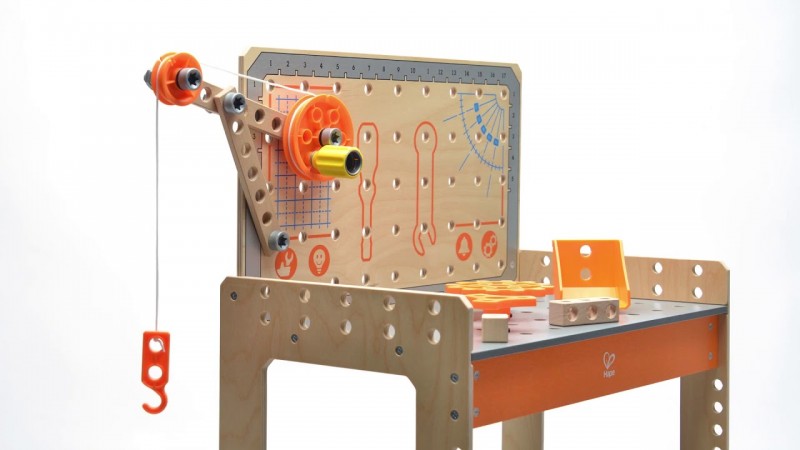 A 79 darabos készlet fa és műanyag elemeket tartalmaz. Fogaskerekek, daru, integető kéz, a mozgóképet bemutató madárka és még sok-sok érdekesség. A praktikus asztalka felülete, és oldalai is alkalmasak arra, hogy különböző szerkezeteket erősítsenek rájuk a gyerekeke a csavarhúzóval, vagy a fogóval. Fejleszti a képzelőerőt és a kézügyességet. A Hape Junior Inventor applikáció ingyenesen letölthető az Apple Store és a Google Pay áruházakból.