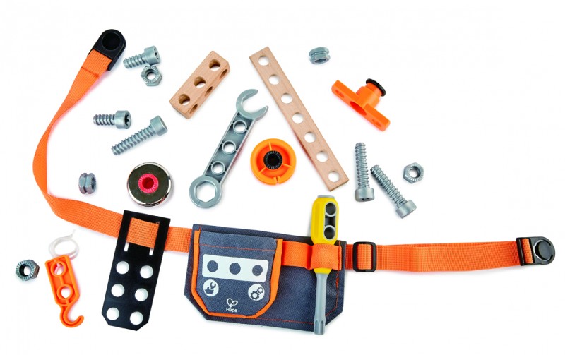 A 19 darabos, fa és műanyag elemeket tartalmazó készletben csavarhúzó, villáskulcs, de még az övre szerelhető kis daru is rendelkezésedre áll. A Hape Junior Inventor applikáció ingyenesen letölthető az Apple Store és a Google Pay áruházakból.
