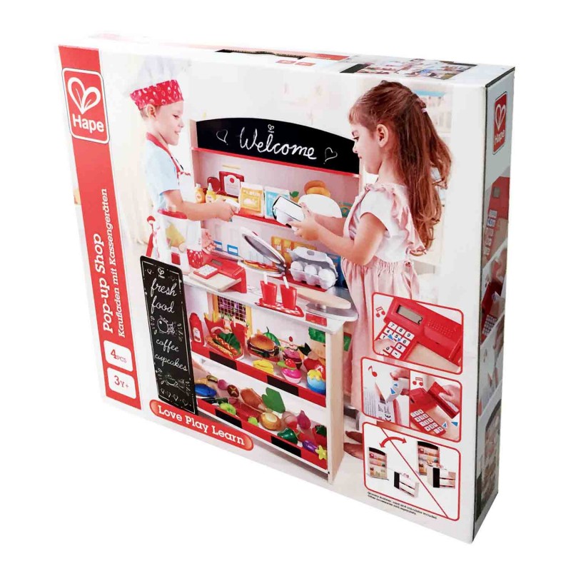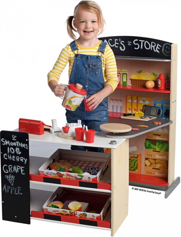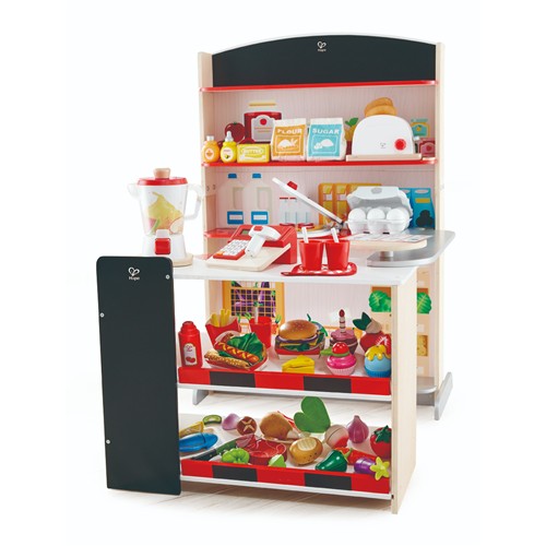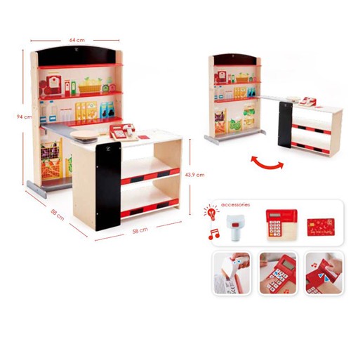 A szekrény tetején és a pult egyik oldalán krétával írható táblák vannak. A szekrény 4 polcos, a pult 2 polcos, melyeket egy plusz pult elem köt össze. Többféleképpen is egymás mellé lehet rakni a bútorokat, ahogy a legpraktikusabb az elrendezés. A készlet tartalmaz még egy kézi szkennert is, amely sípol és villog, amikor a hátoldalán található gombot megnyomjuk. A pénztárgép a megvásárolt termékek árának összesítéséhez használható, majd pedig a fizetéshez a bankkártya terminál. 4 darabos készlet, mely a boltos szerepjátékok remek kiegészítője lehet.