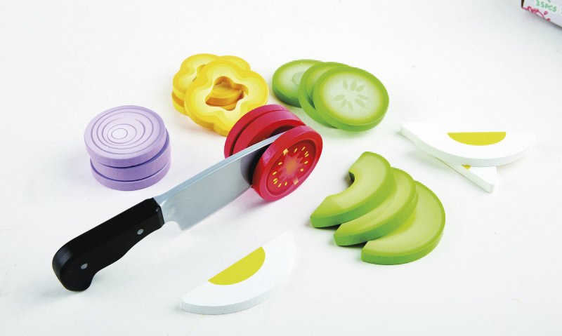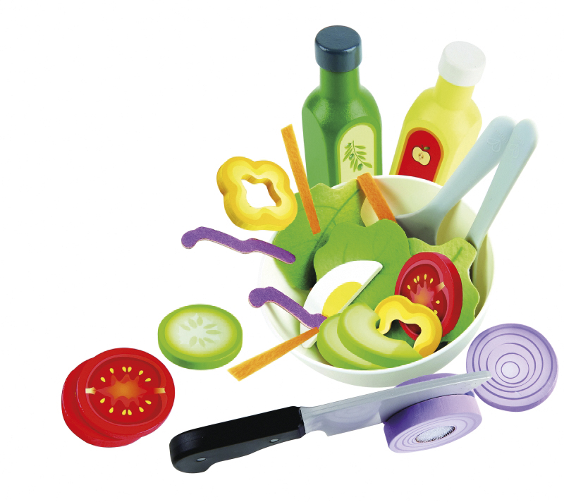39 db-os készlet. A csomag a következő fából készült, tépőzárral összeilleszthető, szeletelhető saláta összetevőket tartalmazza: tojás, avokádó, uborka, paradicsom, hagyma, paprika, melyeket a valósághű játékkés segítségével fel lehet szeletelni. Ezen kívül a készlet része egy salátaedény, egy kanál és villa, valamint két ""üveg"" játék öntet (olaj, ecet). A salátás készletben találhatóak még textilből készült összetevők is: saláta, káposzta, répa."
