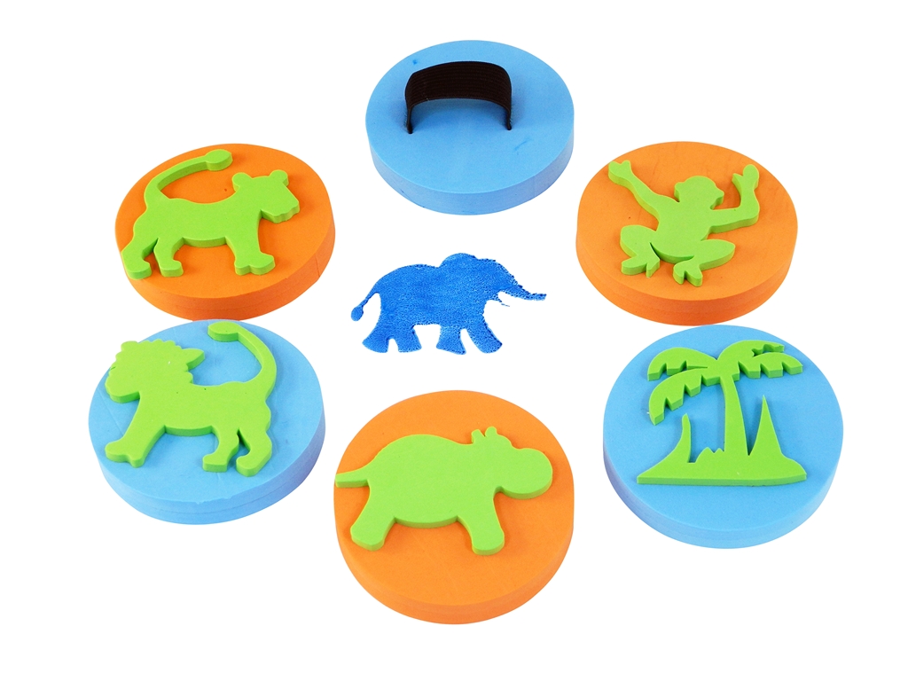 Tartalma: pálmafa, víziló, fiú oroszlán, lány oroszlán, elefánt, majom. A tenyérnyomdák hátulján erős, elasztikus szalag található, így a gyermek felhúzhatja a kezére és kényelmesen használhatja. Ideális használatra kész festékekkel, vagy festékpárnákkal való használatra. A 3 éven felülieknek megfelelő tenyérnyomdák tökéletesek szórakoztató, színező tevékenységekhez. A tenyérnyomdák moshatók, így újra és újra használhatók.