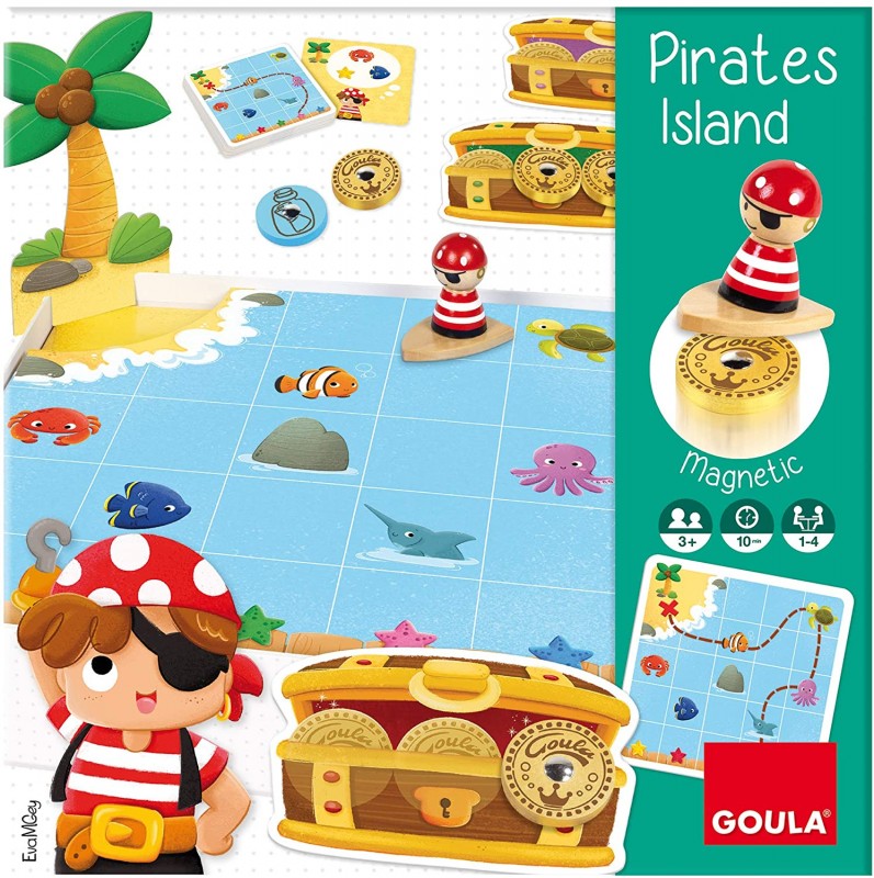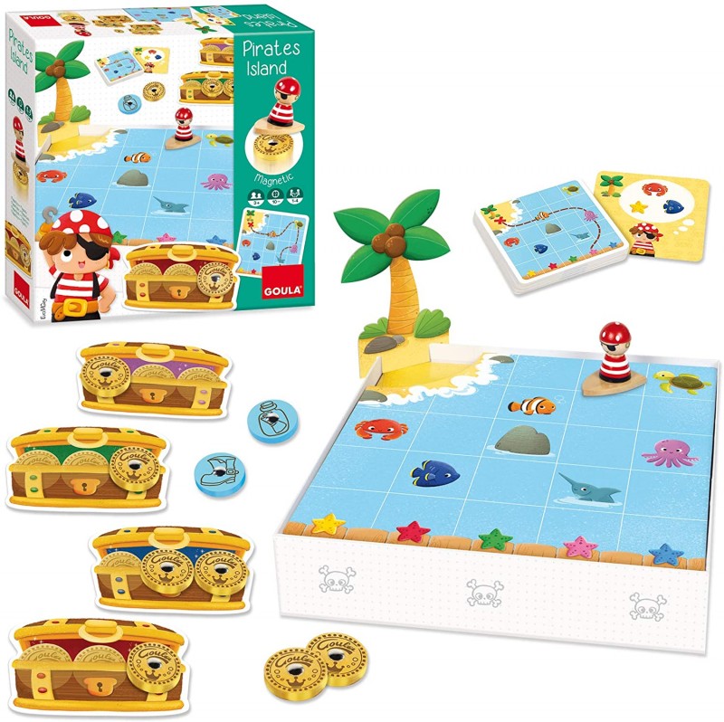 Játék menete: Készítsétek elő a játékot a képek alapján. Helyezd a kártyákat egy helyre úgy, hogy az útvonalat mutató oldala felfelé nézzen, és tedd őket a doboz egyik oldalára. Minden játékos választ egy kincses ládát és maga elé teszi. A legfiatalabb játékos kezd, sorban/felváltva húzzatok az útvonalkártyákból. Helyezd a kalózt a táblára, a kártyán feltüntetett csillagra és juttasd el a szigetre a kártyán feltüntetett állatok mellett elhaladva. Ha szerencsés vagy, találni fogsz egy aranypénzt, amit a szigeten gyűjthetsz be és beleteheted a kincses ládádba. Bármely esetben (ha találtál aranypénzt, vagy ha nem) a következő játékos jön. Tippek/tanácsok: A kalózt úgy irányítsd/mozgasd, hogy nem emeled fel a tábláról és vigyázz! nehogy beleütközz a sziklákba. Ha a szigeten több, mint egy aranypénzt találsz, akkor is csak egyet vegyél el, a többit dobd vissza a tengerbe és add át a lehetőséget a következő játékosnak. Ha kihalászod a palackot, te jössz még egyszer! Ráadásul te döntheted el, melyik csillagról szeretnél kezdeni, majd szabadon végig viheted a kalózt a tengeren, egészen a szigetig. Ha a bakancsot/csizmát halászod ki, balszerencse. Nem szerzel egy aranypénzt sem és a te körödnek vége. Az a játékos nyer, aki elsőként szerzi meg a 3 aranypénzt. Ha 4 játékos esetén a játék döntetlenre végződik (mivel minden játékosnak 2 aranypénze van), akkor mindenki győztesnek számít. Játék variáció: Szabad hajózás/navigáció. Használd a kártya sárga oldalát. A játék menete ugyanaz, de a játékosok szabadon navigálhatnak. Minden játékos a saját turnusában/körében húz egy kártyát és megtervezi az egyedi útját. Az egyetlen szabály, hogy az utat mindig a kártyán megjelölt csillagról kell kezdeni és a 2 kijelölt állatot érinteni kell. Az a játékos nyer, aki elsőként gyűjt össze 3 aranypénzt. Egyéni játék: Helyezd el a 8 aranypénzt a tenger alatt és próbáld meg megtalálni őket a lehető legrövidebb idő alatt. A játékot lehet kártyákkal vagy azok nélkül is játszani.