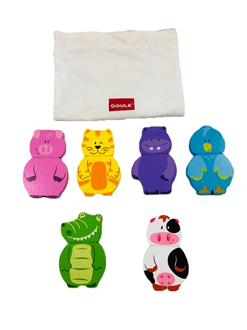 6 db fa állatka (boci, malac, cica, víziló, kismadár és krokodil) melyek mindegyike 2 db mágneses fa elemből áll össze. A fejük és a testük mágnessel illeszthető össze.