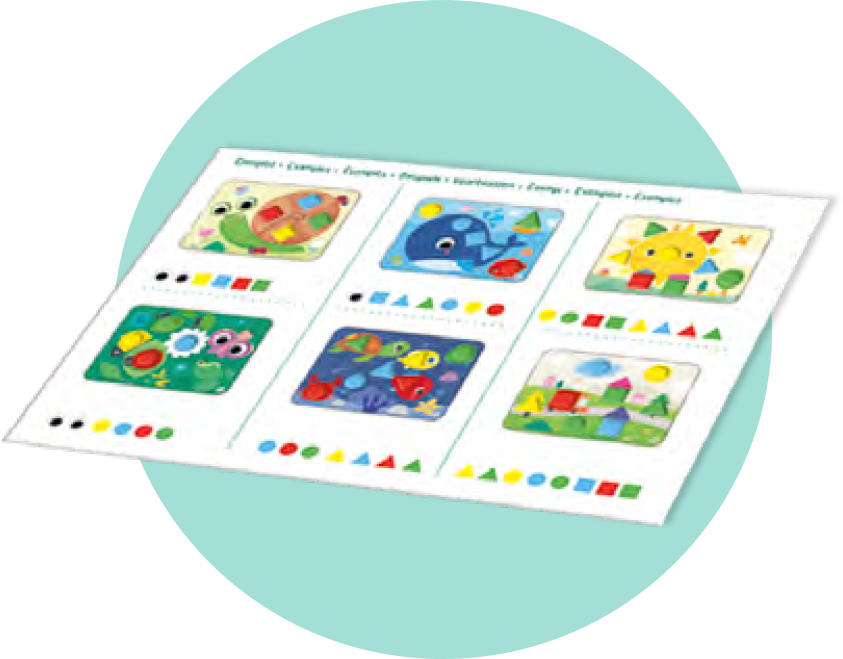 Tartalma: 6 db kétoldalas feladatkártya, 14 db geometriai forma különböző színekben (4 db négyzet, 4 db kör, 4 db háromszög, 2 db kör alakú szem)