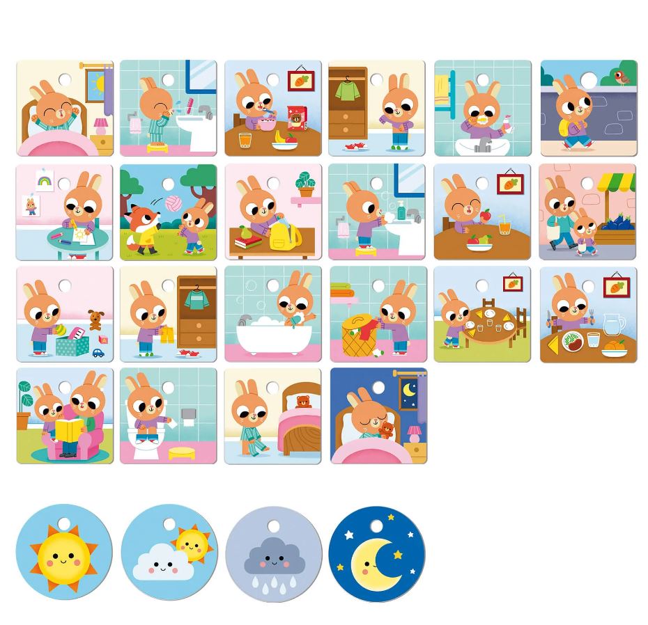A kártyákon apró nyuszi ábrázolja a tevékenységeket.