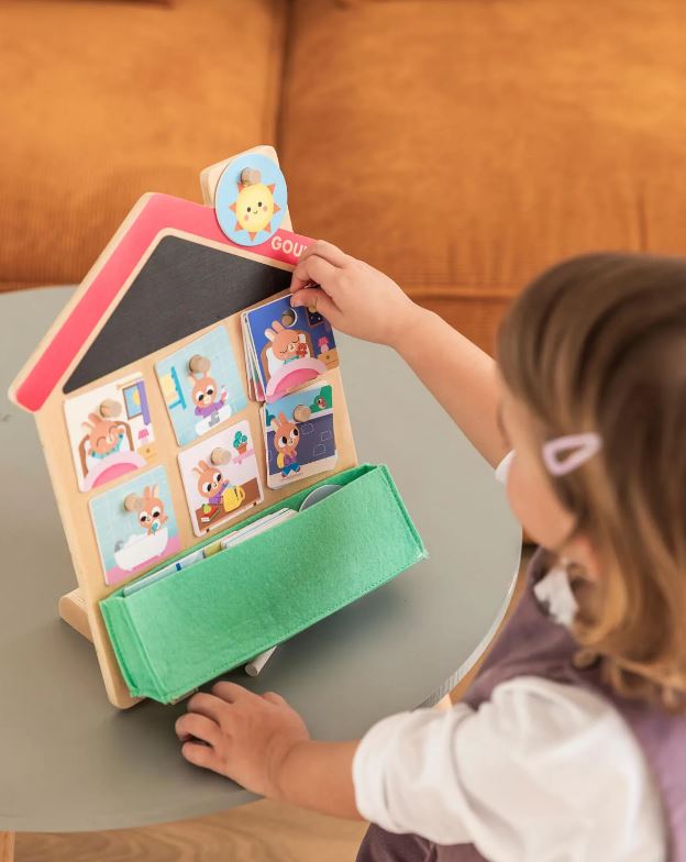 A kis táblán jól ábrázolhatók a napi teendők és feladatok, így a kicsik könnyedén tudják azokat ellenőrizni és követni. Mindezen felül reggelente saját maguk is kicserélhetik az egyes kártyákat, így is felkészülve az aznapi feladatokra.