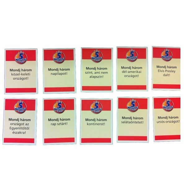 Az izgalmas társasjáték lényege, hogy 5 másodperc alatt kell felsorolni olyan szavakat, amik a kihúzott kártyán lévő témakörhöz kapcsolódnak. Mondj 3 filmhőst, piros színű dolgot, kutyafajtát.