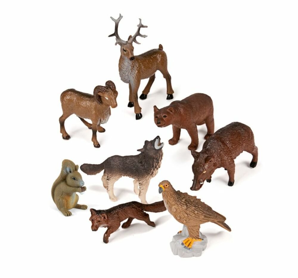 Tartalma: 8 db erdei állatfigura - muflon, vaddisznó, róka, farkas, mókus, szarvas, medve, sas