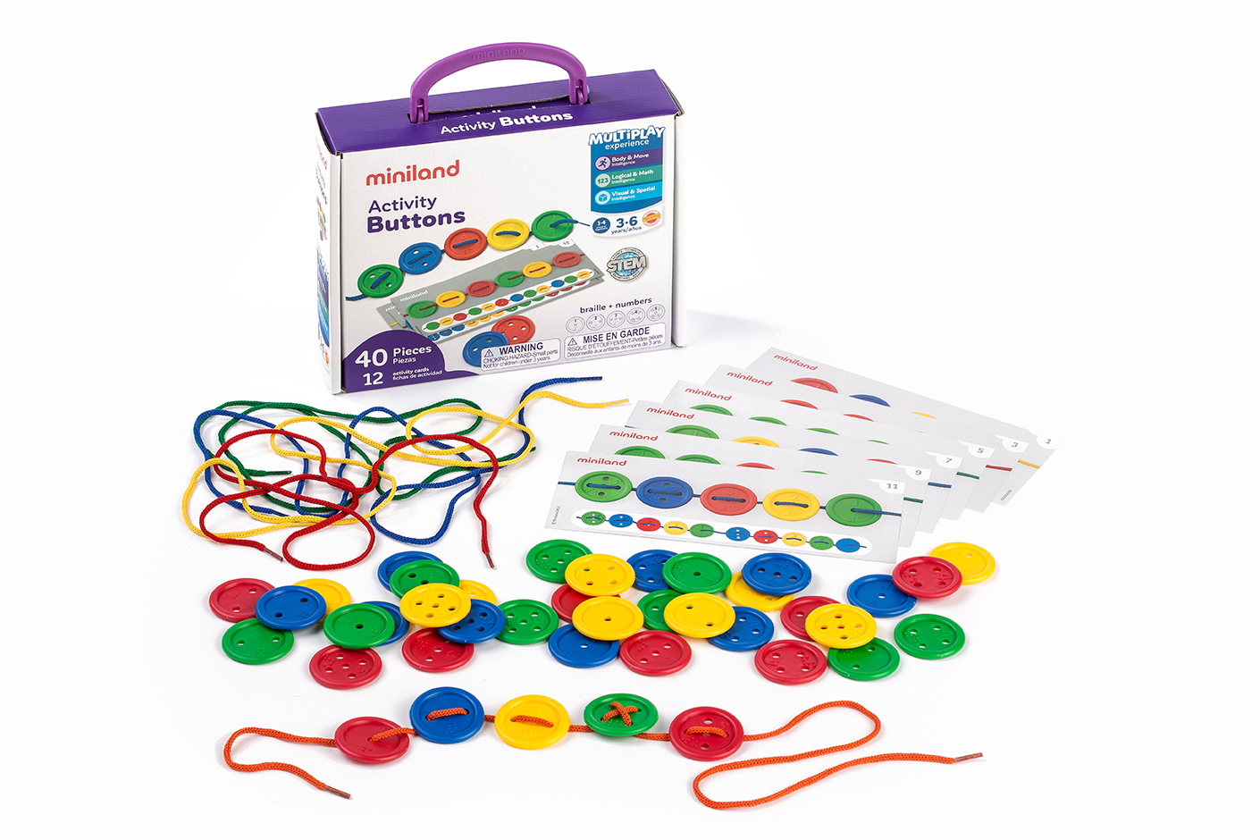 A minél sokszínűbb feladatok érdekében 12 db feladványkártya is a szett részét képzi, így a gyermekek önállóan is tudják fűzögetni a gombokat a megadott szabályt követve.