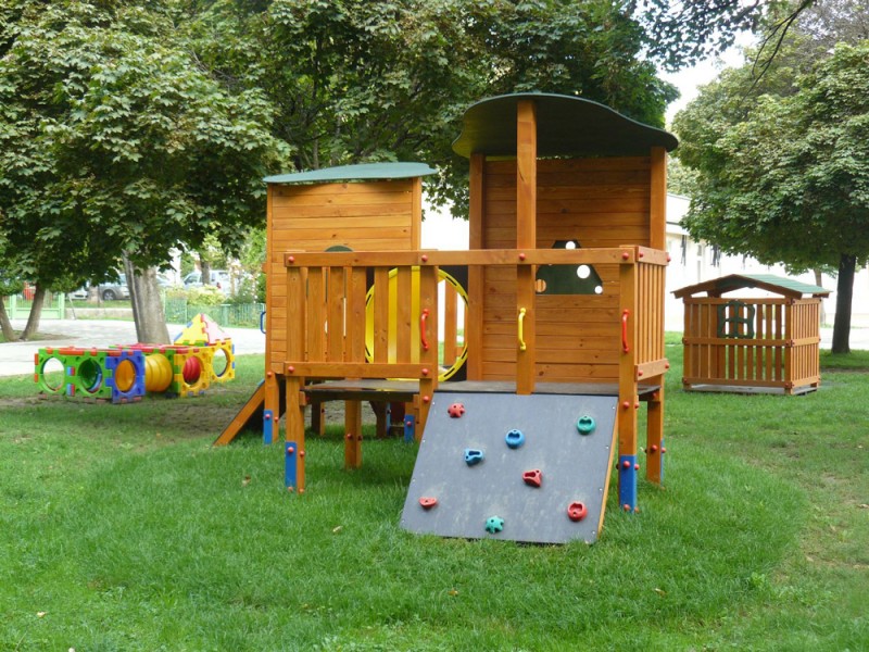 Anyaga: hossztoldott, élmart, rétegragasztott, vékonylazúrral kétszeresen kezelt kontrapozíciós fenyőgerenda, felületkezelt fenyő kerítéselemek, HDPE műanyag tető és díszítő elemek, átbújócső hossza 100 cm, átmérője 60 cm, műanyag kapaszkodók, műgyanta alapanyagú, anyagában színezett mászókövek, műanyag csavartakarók, üvegszálas, beülőkaros csúszdaelem, színterezett, fém tartólábak, beton pontalapokkal rögzítve a talajba.
