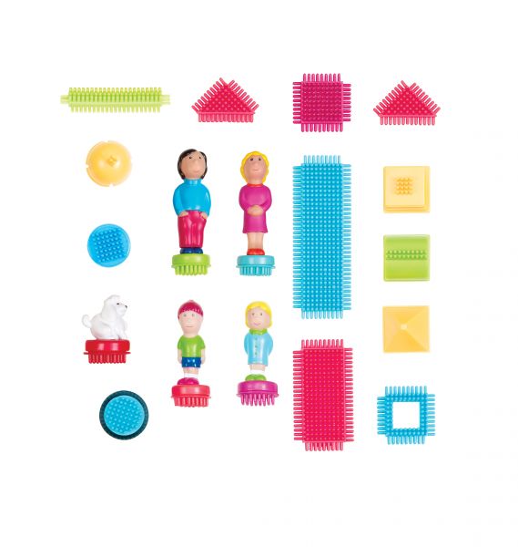 A kedvelt tüske építők kiegészülve egy teljes családdal. A készlet összesen 85 darabból áll, számos különböző méretű, formájú és színű elemmel. Az anyuka, az apuka, a kisfiú és a kislány gyerek és a fehér kiskutya figura talpa is tüskés, így könnyen rögzíthetőek bármelyik másik elemhez. A kerekek használatával lehetőség van járművek építésére is a házakon felül. Minden elem élénk színekkel lett ellátva. Piros, ciklámen, zöld, citrom- és narancssárga, világos- illetve sötétkék elemeket egyaránt tartalmaz a szett. A megszokott négyzet és téglalap formákon túl megtalálható háromszög, gúla, félgömb vagy áttört/lyukas forma is. Az építőelemek és a figurák is műanyagból készültek, így kimondottan hosszúéletű játék.