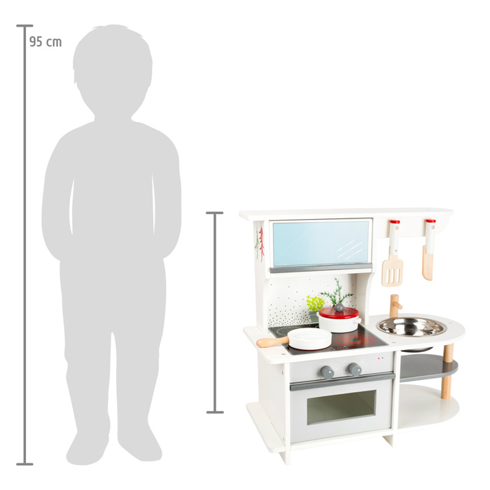 Az apró részletekig megtervezett konyhában játék légkeveréses sütő, indukciós főzőlap, és fém mosogató tálca is helyet kapott.