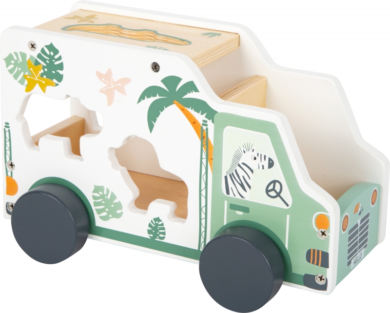 Ezzel a népszerű, szafari megjelenésű, fa formabedobó autóval a zsiráf, víziló, oroszlán és barátaik kirándulnak a szafarin, miközben a barátságos zebra vezeti a fa járművet.