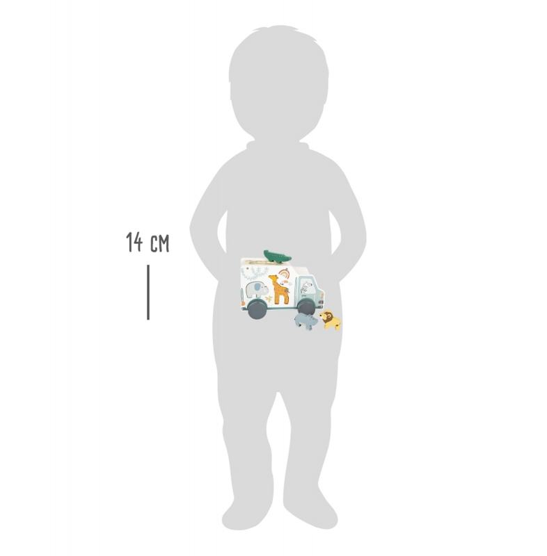 A szafari buszon összesen öt állat alakú furat található, amelyeken keresztül a megfelelő figurák behelyezhetők. Szeretettel megtervezett jármű, amely játékosan tanítja a formák és a motoros képességek felismerését.
