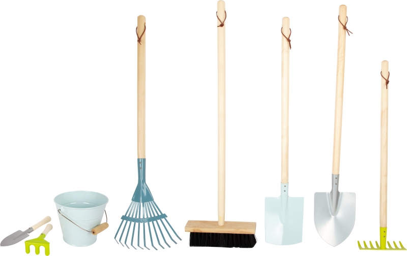 Ez az átfogó, modern színű kertészeti eszközkészlet egy ásót, egy lapátot, egy gereblyét, egy seprűt, egy vödröt és két kis kerti szerszámot tartalmaz, amelyek mindegyike megfelelő munkát kínál egy kis kertésznek.