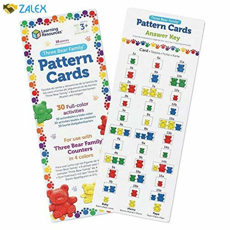 A kártyákon az eredeti mackókkal megegyező színű és méretű alakok láthatóak, ezeket a megadott szempont alapján le kell másolni vagy folytatni a sorozatot. A mackók körül, játékos mancsos mintával van körbe futtatva a lap széle. A keret színe lehet zöld, citromsárga, kék vagy piros. Ezek a színek megegyeznek a mackók színeivel.