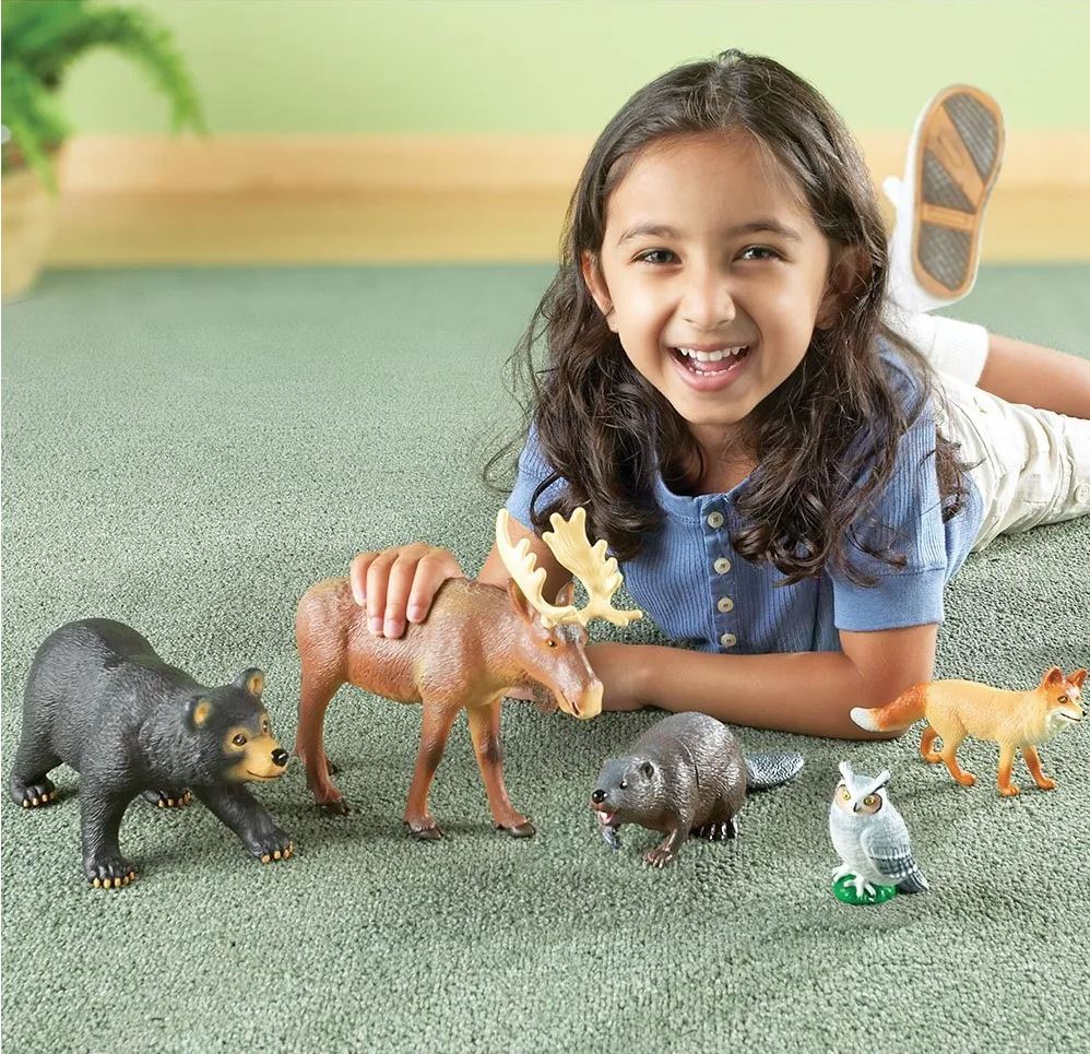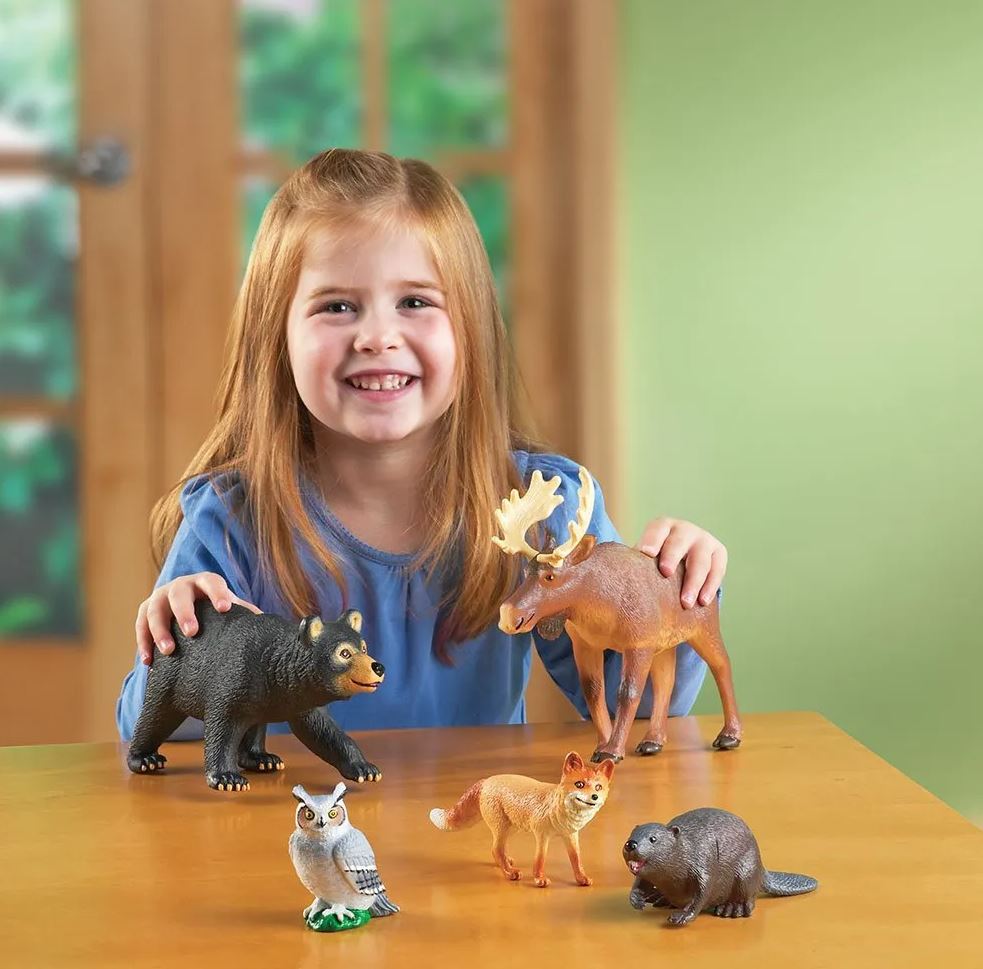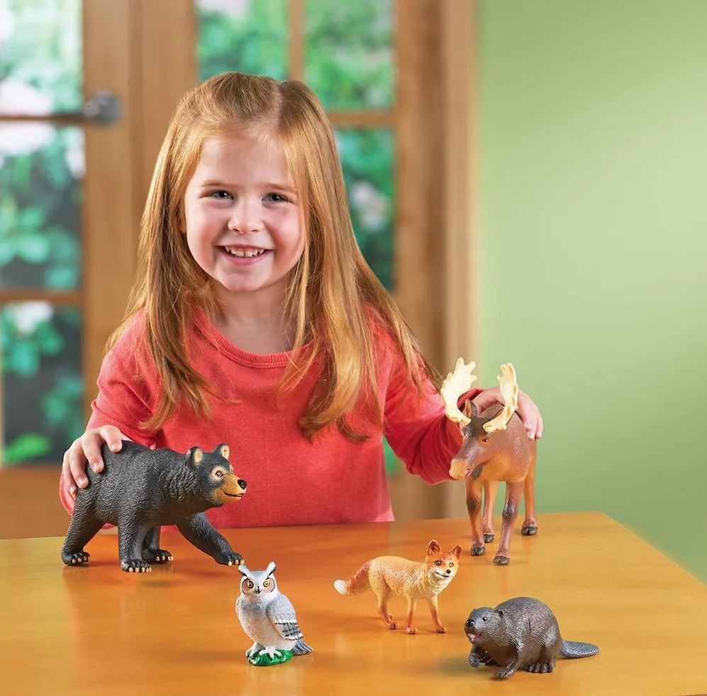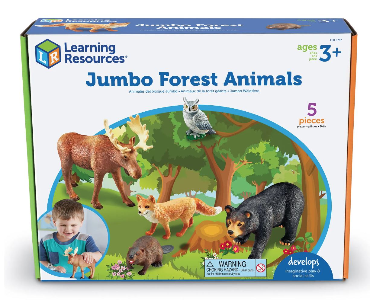 A Learning Resources Jumbo termékcsaládjának - Erdő állatait tartalmazó készletében megtalálható mind az öt ismert és szeretett állat az erdőből, így a róka, a bagoly, a hód, a szarvas és a medve is helyet kapott a készletben.