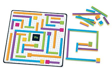 A Learning Resources gondolkodó labirintus játéka 44 db építőelemből és 25 db kétoldalas feladatkártyából áll.