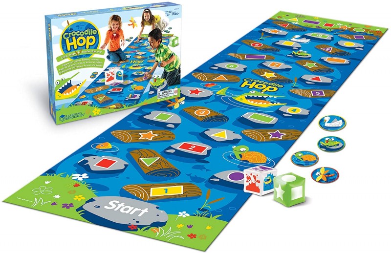 A Learning Resources Ugrás a folyóba! játékának tartalma 1 db műanyag, színes szőnyeg, 2 db felfújható 12 cm-es kocka, 40 db állatos korong és egy tevékenység útmutató.