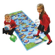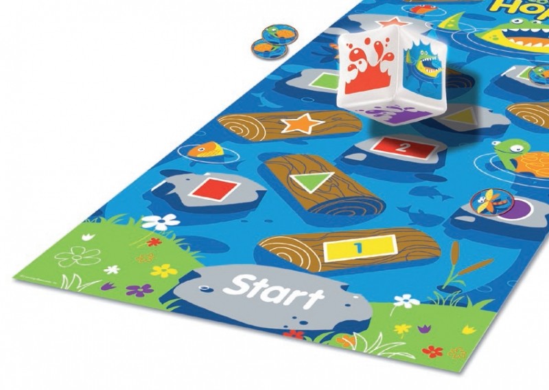 Ler 9544 Kroki hopp Ugrás a folyóba A gyerekeknek a startmezőről indulva kell eljutniuk, különböző feladatokat megoldva a célig. A folyón színről, számra ugorhatunk, a kicsik megtanulják 1-10ig a számokat és az alakzatokat is megismerik. Javítja a problémamegoldó készséget játék alkalmas egyéni, csoportos játékhoz is. Gyönyörűen illusztrált pálya tele kövekkel akadályokkal úszó fadarabokkal állatokkal és egy aranyos kis krokodillal aki visszaküld a start mezőre. Tartalmaz: Játékszőnyeg 40 jelölő (4 állat 10mindegyikből) 2 felfújható dobókocka Játékleírás Játékleírás Nevezd meg a színt vagy a formát Terítsük ki a szőnyeget a padlón. A tanulók álljanak a start-hoz majd nevezzenek meg minden színt és formát úgy, hogy ráállnak egy kőre vagy fadarabra. Ha sikerül megnevezni tovább léphetnek. Folytassuk amíg át nem ér mindenki a folyón Jelölő Terítsük ki a szőnyeget. A tanár dob a szín kockával és a tanulók megkeresik az összes követ és fát a megfelelő színnel majd egy jelölőt helyeznek rá. Folytassuk új dobással és új jelölésekkel. Ha krokodilt dobunk minden jelölőt szedjünk le. Ismételjük meg a játékot a forma kockával. Formafelfedező Terítsük ki a szőnyeget. Dobjunk mindkét kockával és nevezzük meg a kombinációt (pl Sárga kör) Ha a gyerekek meglátták a megfelelő kombinációt kézfeltartással jelzik. A tanár kihív egy jelentkezőt és a jelre állítja. Ismételjük amíg mindenki helyet talált. Ha krokodilt dobunk bármilyen kombinációt mondhatunk Átkelünk a folyón Terítsük ki a szőnyeget. A tanulók próbáljanak úgy végig sétálni rajta, hogy csak a számozott kövekre és fákra lépnek. Ahogy halad mondja hangosan a számokat, amiken áthalad. Remek módszer a számok felismerésére. Visszafele számolni is gyakorolhatunk ezesetben a tanulók a 10es mezőről kezdenek. játékok átkelünk a folyón színekkel (2-4 játékos vagy csapat) Hozzávalók Játékszőnyeg szín kocka állatos jelölő minden játékosnak/csapatnak Helyezzük a szőnyeget a padlóra, hogy mindenki lássa. Minden játékos/csapat választ egy jelölőt és a start mezőre helyezi. Az első játékos dob a szín kockával majd a jelölőt a legközelebbi azonos színű kőre vagy fára helyezi. A játékosok folytassák amíg valaki a végére nem ér a folyónak. Aki krokodilt dob egy körből kimarad. Aki számozott mezőre érkezik újra dobhat, ha felismeri a számot! átkelünk a folyón formákkal (2-4 játékos vagy csapat) Hozzávalók Játékszőnyeg forma kocka állatos jelölő minden játékosnak/csapatnak A játék megegyezik a fenti leírással kivéve, hogy ezúttal a forma kockával dobunk és a formákra lépünk Vad krokodil (2-4 játékos) Hozzávalók Játékszőnyeg Forma kocka Szín kocka 3 jelölő minden csapatnak Terítsük le a szőnyeget. A játékosok dobnak mindkét kockával majd a megfelelő helyre helyezi az egyik jelölőt. A következő játékos is így tesz. A játékosok dönthetnek, hogy egy új jelölőt vagy egy már használtat hoznak játékba. Az a játékos nyer, akinek mind a három jelölője elsőnek ér célba. - Ha valaki a szín kockával krokodilt dob, bármilyen kidobott színű, de a forma kockának megfelelő mezőre léphet - Ha valaki a forma kockával krokodilt dob, bármilyen kidobott formájú, de a szín kockának megfelelő mezőre léphet - Ha valaki mindkét kockával krokodilt dob, az bárhova léphet!