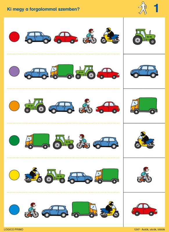 A Logico Primo feladatkártyákat a 3 és 6 év közötti óvodások és iskola-előkészítő csoportokba járó gyermekek számára alkották meg. Fejleszti a szem-kéz koordinációt, a vizuális észlelést, a mennyiségek és színek felismerését, a térbeli tájékozódást, a nyelvi kifejezésmódot, a koncentrációt és a logikai összefüggések gyakorlását. Az Autók, utcák, táblák az alábbi témákat dolgozza fel: Közlekedési táblák felismerése Biztonságos gyalogos közlekedés Logikai kapcsolatok Közlekedési szabályok betartása KRESZ alapok A Logico Primo feladatkártyák csak a Logico Primo kerettel együtt használhatóak!