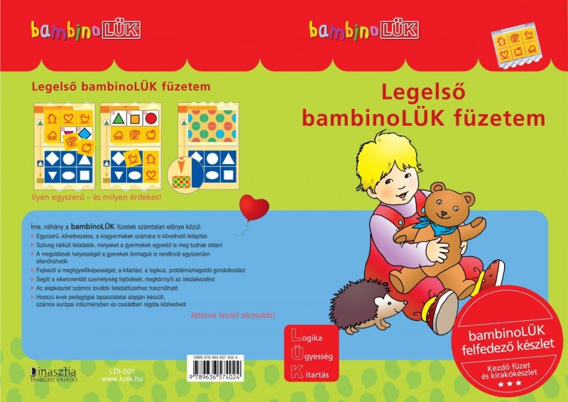 A 2-3 éves kortól használható füzet lépésről lépésre vezeti be a kisgyermeket a BambinoLÜK varázslatos világába. Az első kiadvány célja a lapról lapra nehezedő feladatokkal megtanítani a kicsit a LÜK használatára. Amint ennek a végére ér, következhetnek a későbbi feladatokhoz már hasonló, egyre összetettebb logikai gyakorlatokat tartalmazó BambinoLÜK füzetek.