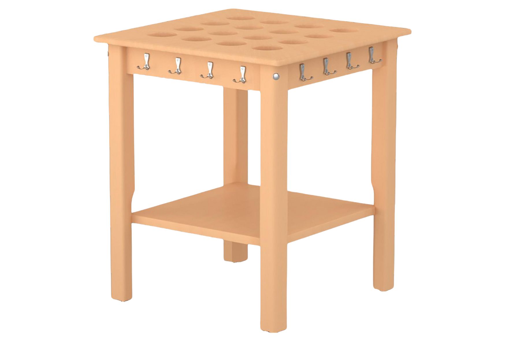 16 pohár számára készült, 16 db kétágú akasztóval ellátott asztal. Lábai fixek. A poharak az előrefúrt lyukakba könnyen beilleszthetők, így mozgatáskor sem kell attól tartanunk, hogy a poharak leborulnak. Lapraszerelt termék.