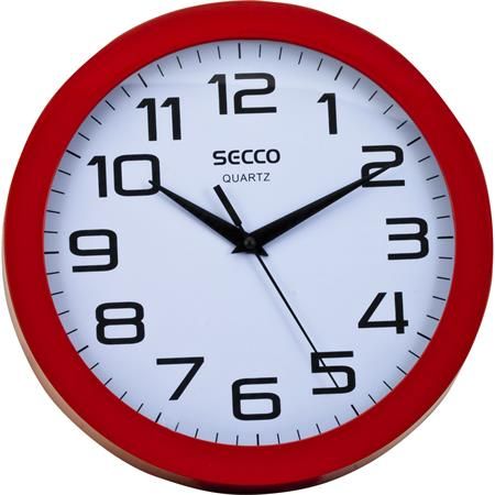Kör alakú, műanyag piros színű keret, analóg FEHÉR számlap, fekete arab számokkal.