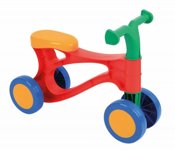 Lábbal hajtható kismotor, 4 kerekű, műanyag. A kisgyermekek kedvenc közlekedési eszköze. Az első két keréknek köszönhetően sokkal stabilabb a hasonló kismotorokhoz képest. Súlya csekély, így amennyiben gyermeke éppen nem használja a motort, könnyen vihető kézben is. A kormány kialakításnak köszönhetően felakaszthatjuk a babakocsira is.