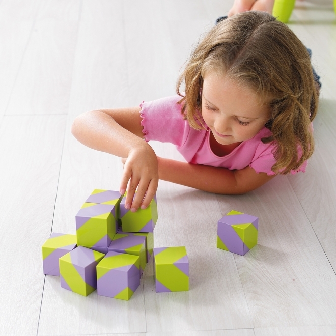 Tartalma: 16 db kocka zöld-lila sávokkal, 6 db feladatkártya, 1 db játékszabály