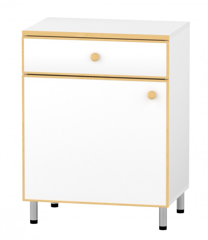 Egy fiókos és egy ajtós kis tálalószekrény. Mérete: 60x40x90 cm, anyaga: fehér laminált bútorlap - keményfa élzárással. A bükk élzárás egyedi külsőt kölcsönöz a tálalószekrényenk. A fém lábak kis mértékben állíthatóak.