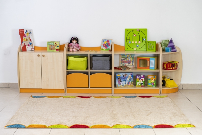Kellemes, bézs alapszínű szőnyeg, melynek két hosszabbik szélén különböző színű félkörök helyezkednek el a következő színekben váltakozva: kék, narancs, zöld, piros. A félkörök lehetőséget adnak csoportos foglalkozásokra, melyben a gyerekek egy-egy félkört kiválasztva lekucorodhatnak. A szőnyeg többi felülete mintamentes.