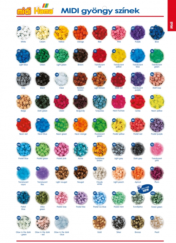 A Hama gyöngy különlegessége, hogy több mint 50 féle színből lehet választani. Köztük megtalálhatóak pasztell, neon, világítós, csíkos gyöngyök is a választékban.