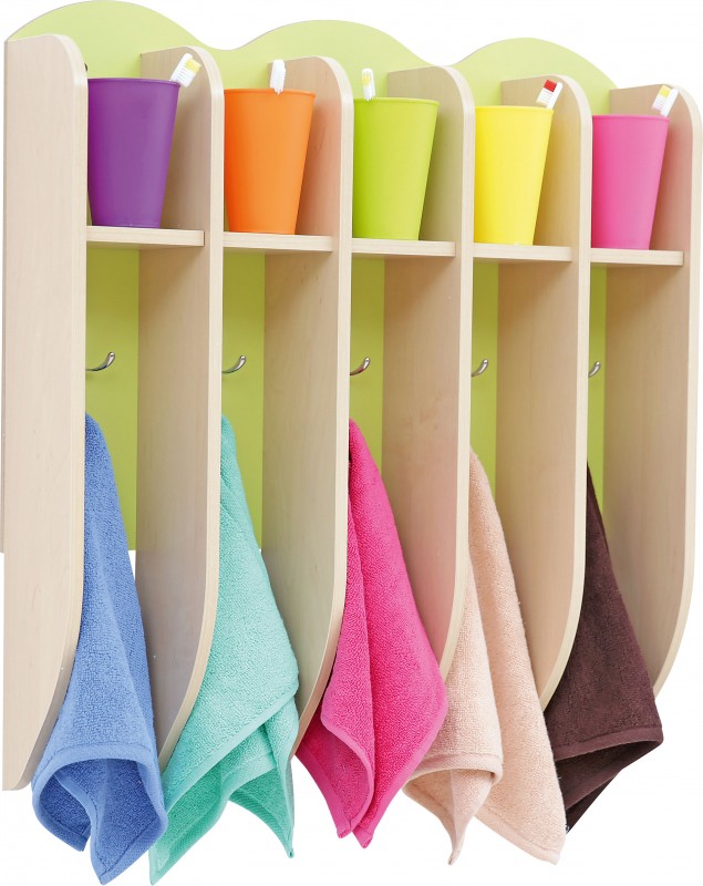 5 fakkos törölköző- és fogmosópohár tartó 5 különböző színben. Praktikus kiegészítő, 5 fogmosópohár tartóval, 10 akasztóval, ahova a törölközőket lehet felakasztani.