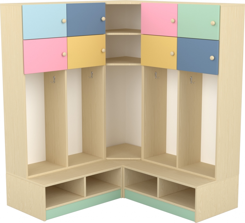 Rendelhető rácsos vagy polcos cipőtartó résszel, juhar vagy világosbükk alapszínben, attól függően mi illik legjobban az adott csoporthoz.