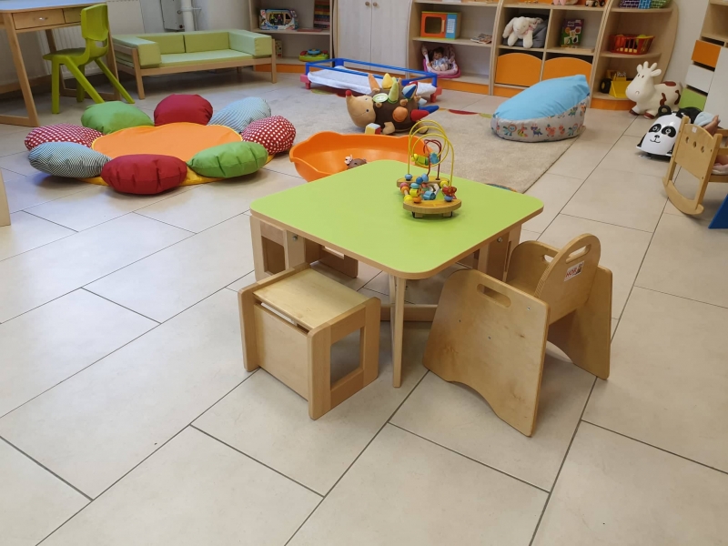 Stílusa megegyezik a hozzá illő, kétállású gyermek ülőkével, gondozónői asztallal, térelválasztóval. Fa, keretes lábai egyedivé és szellőssé teszik a csoportszobát. Mérete: 65x65x40-46 cm - állítható magasság. Az asztal sarkai lekerekítettek, biztonságosak. Előírásoknak megfelel. Lapraszerelt termék.