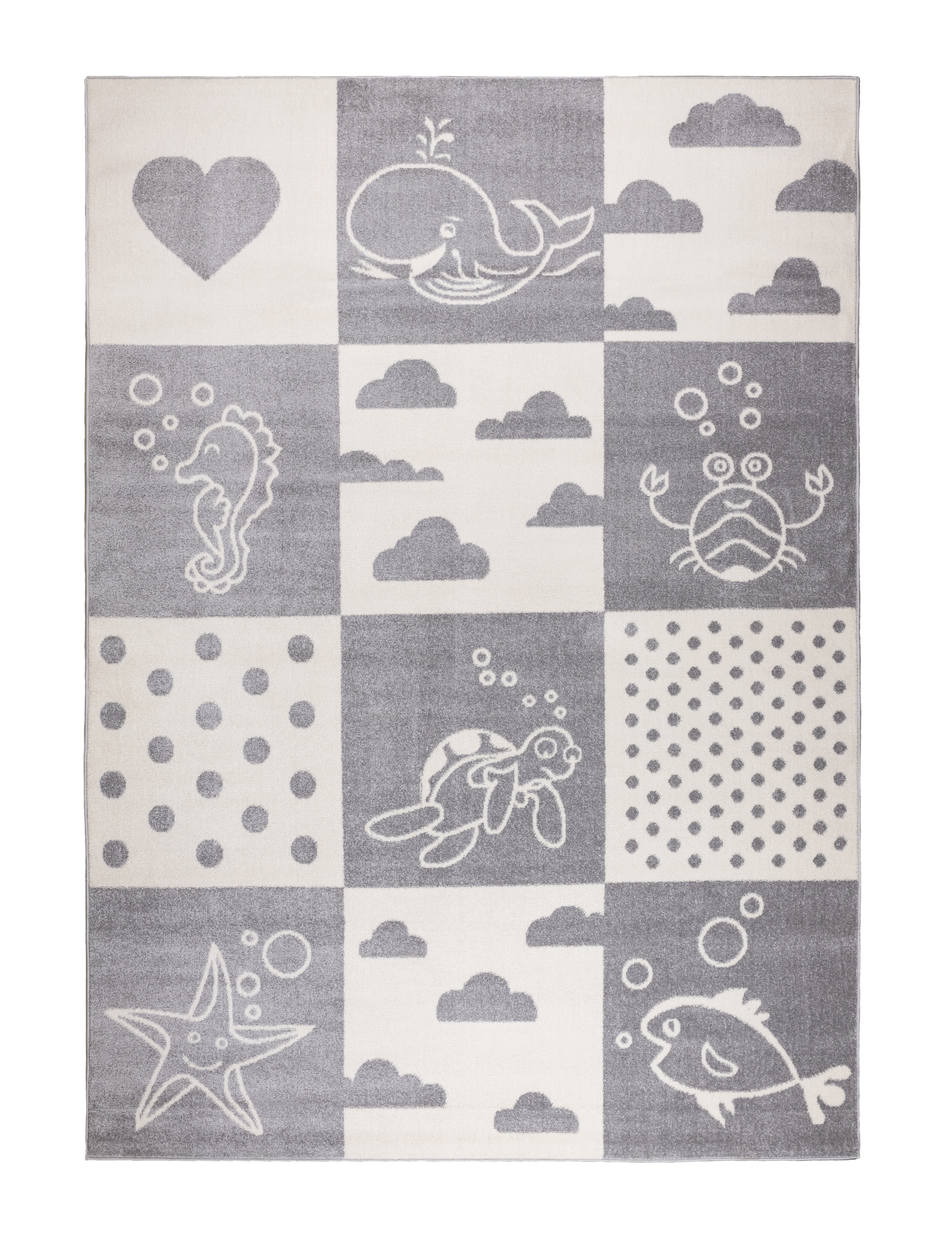 A szőnyeg alapja világosszürke és fehér, szürke-fehér mintákkal.